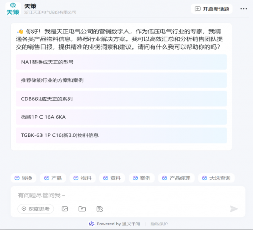 “天策”AI应用界面截图 作为“电气+AI应用”的行业先行者,天正打造的“天策”AI营销数字人,具有“售前查询快人一步、复杂需求化繁为简、选型报价零等待、快速获得客户信任”四大核心优势,既能够快速查询产品系列说明、技术资料、典型案例等企业知识,还能够智能匹配产品型号,高效输出定制化解决方案,实现从“经验驱动”向“数据+AI驱动”的销售模式转型,更好地为客户创造价值。